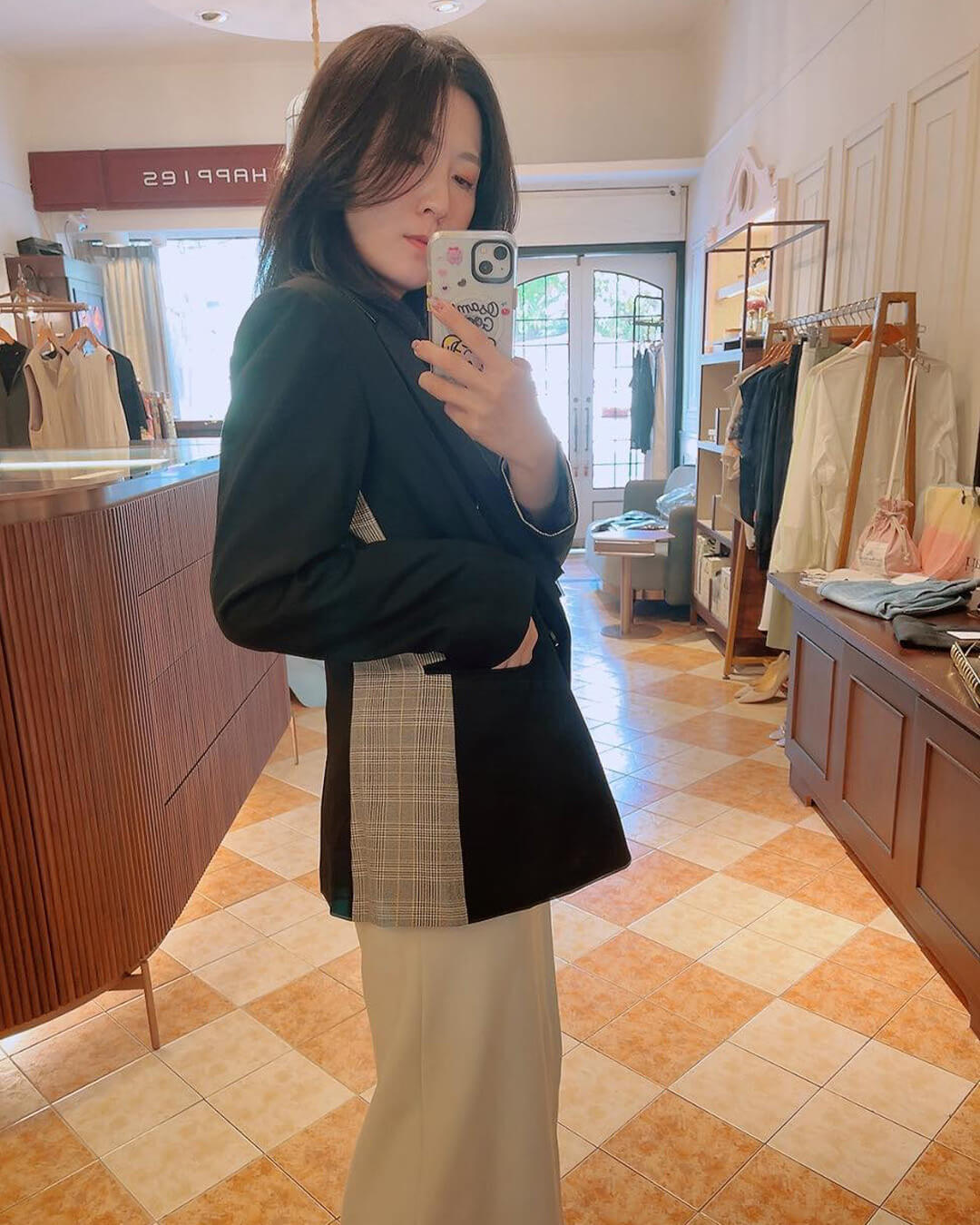 黑色搭配格紋拼接的設計感西外,剪裁俐落、質感出眾,正式休閒皆適合。